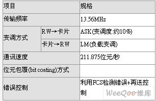 此時RW若傳送資料給IC卡片時,RW會傳輸變調度大約10%左右的ASK(振幅輸變)信號給IC卡片,IC卡片檢測該信號并轉換成資料;反之如果從IC卡片傳送資料給RW時,IC卡片變成從RW接收無變調信號狀態(tài),接著利用IC卡片內的變調器產生負載變動,RW將此負載變動當成自我loop天線,亦即RW的天線的電流、電壓變化檢測并將資料復調。表1是FeilCa的物理層與資料鍊層的主要規(guī)格。