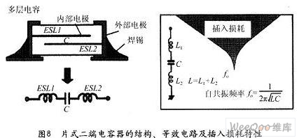 應(yīng)該說片式二端電容器的出現(xiàn)對(duì)于改進(jìn)普通引線式電容器的自諧振問題是很有好處的,因?yàn)槠蕉穗娙萜鞯囊€長度得到了最大限度縮減。但由于電容器內(nèi)部的構(gòu)造,并不能夠消除內(nèi)部電極的殘留電感,這樣當(dāng)頻率達(dá)到使電容器的容抗XC同殘留電感的XL的絕對(duì)值相等時(shí),二端電容依然會(huì)產(chǎn)生自諧振,參見圖8。由于自諧振頻率的存在,當(dāng)噪聲的頻帶超過自諧振頻率之后,噪聲的抑制效果會(huì)急速下降。但是與普通有引線的二端電容相比較,還是有很大改進(jìn)。