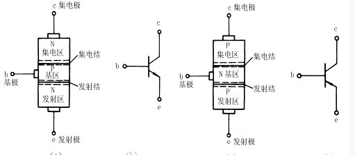 導(dǎo)體二極管內(nèi)部只有一個(gè)PN結(jié),若在半導(dǎo)體二極管P型半導(dǎo)體的旁邊,再加上一塊N型半導(dǎo)體如圖5-1(a)所示。由圖5-1(a)可見(jiàn),這種結(jié)構(gòu)的器件內(nèi)部有兩個(gè)PN結(jié),且N型半導(dǎo)體和P型半導(dǎo)體交錯(cuò)排列形成三個(gè)區(qū),分別稱(chēng)為發(fā)射區(qū),基區(qū)和集電區(qū)。從三個(gè)區(qū)引出的引腳分別稱(chēng)為發(fā)射極,基極和集電極,用符號(hào)e、b、c來(lái)表示。處在發(fā)射區(qū)和基區(qū)交界處的PN結(jié)稱(chēng)為發(fā)射結(jié);處在基區(qū)和集電區(qū)交界處的PN結(jié)稱(chēng)為集電結(jié)。具有這種結(jié)構(gòu)特性的器件稱(chēng)為三極管。