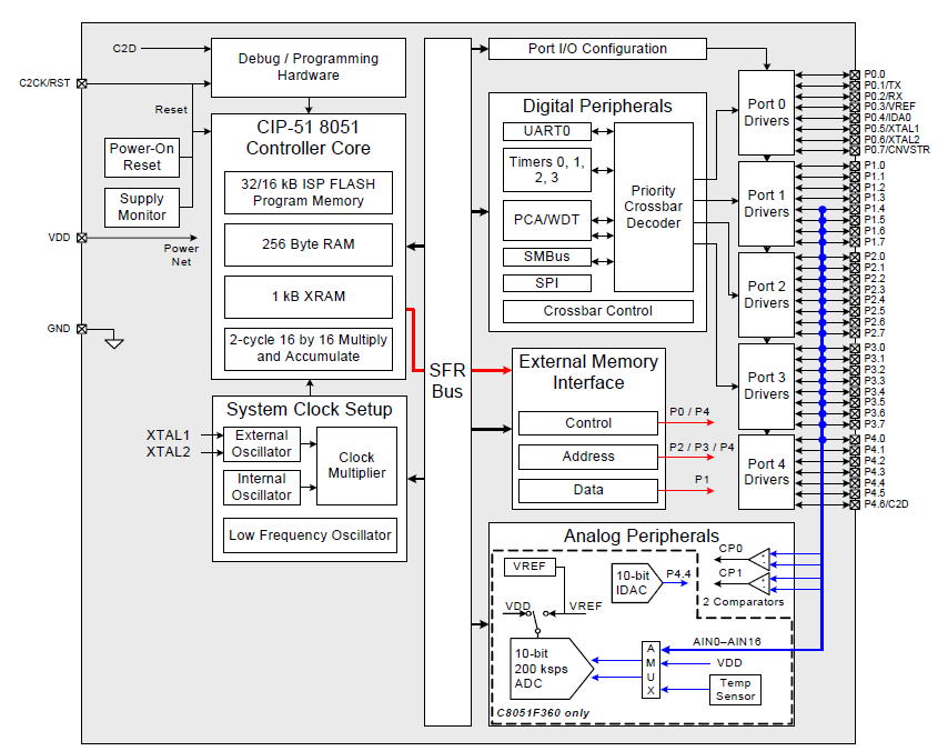 -32 kB ('F360/1/2/3/4/5/6/7)或16 kB ('F368/9)閃存;系統(tǒng)內(nèi)可編程的1024字節(jié)扇區(qū)-1024字節(jié)被保留在32 kB設備中
