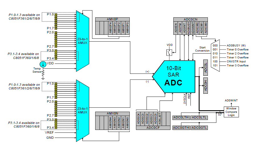 C8051F360/1/2/6/7/8/9器件包括一個片上10位SAR ADC,差分輸入復用器有多達21個通道。該ADC的最大吞吐量為200 ksps,提供真正的10位線性度,INL和DNL為±1 LSB。該ADC系統(tǒng)包括一個可配置的模擬多路復用器,可選擇正負ADC輸入。端口1-3可作為ADC輸入;此外,片上溫度傳感器輸出和電源電壓(VDD)也可作為ADC輸入。用戶固件可以關(guān)閉ADC以節(jié)省電力。