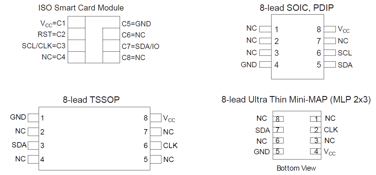 PDIP 封裝中與 Atmel® AT24CXXX 串行 EEPROM 的引腳配置相同。